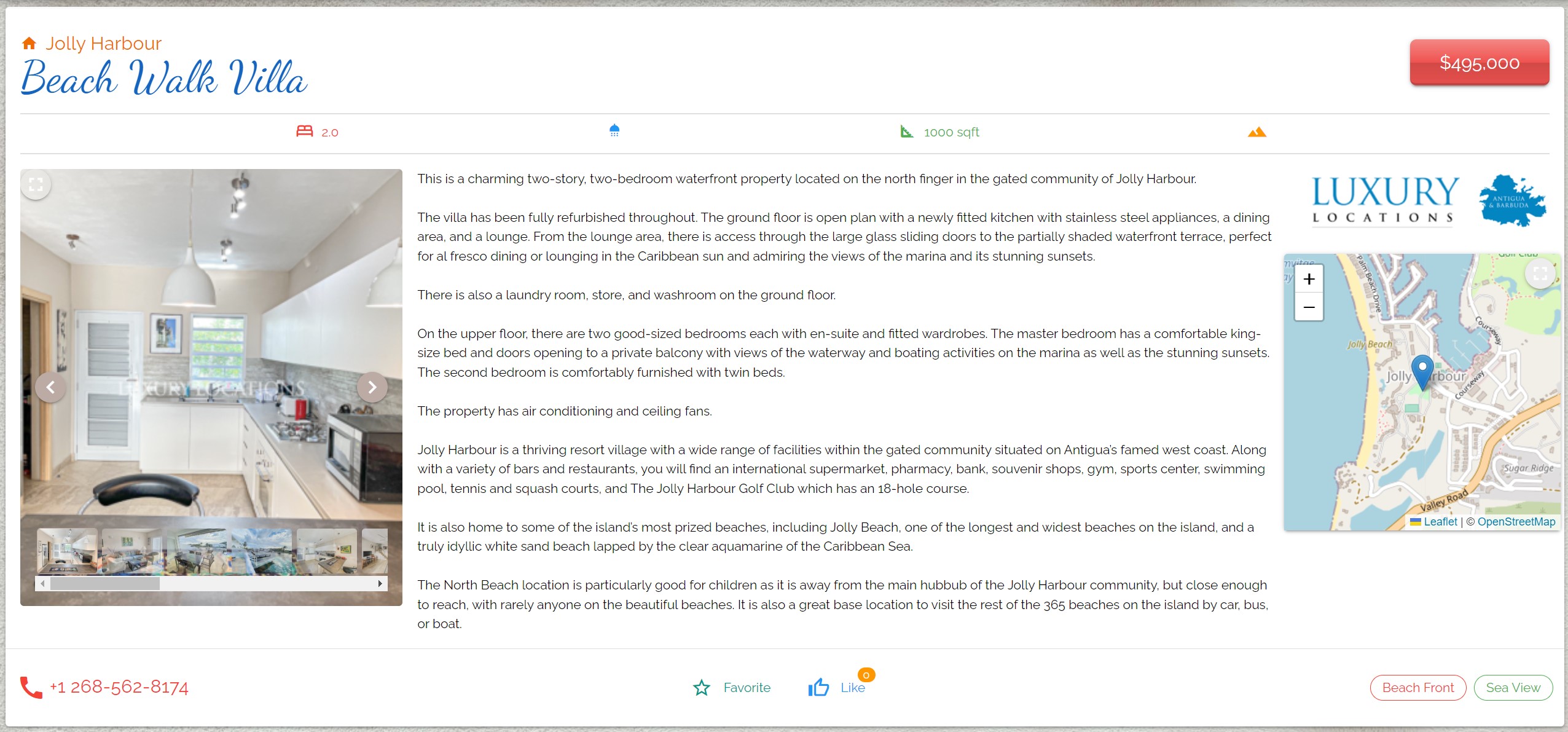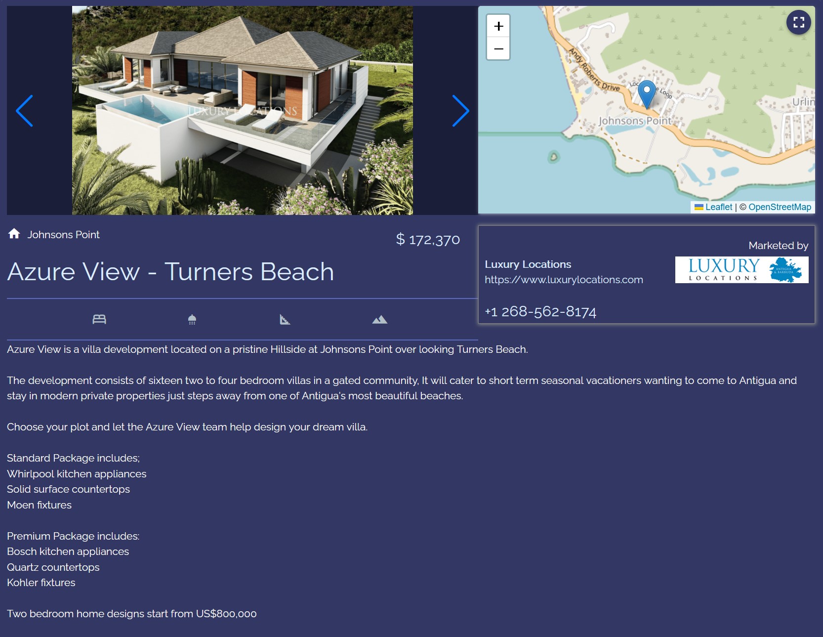 Howering over blue pin will show property name, while click will open pop-up with the property details.