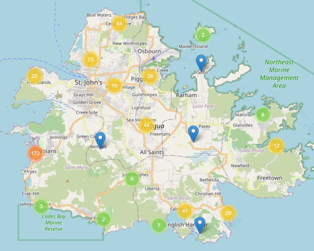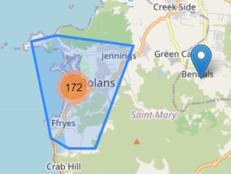Hovering over pins that represent multiple properties will draw area of locations of the properties, while click will zoom into the area: